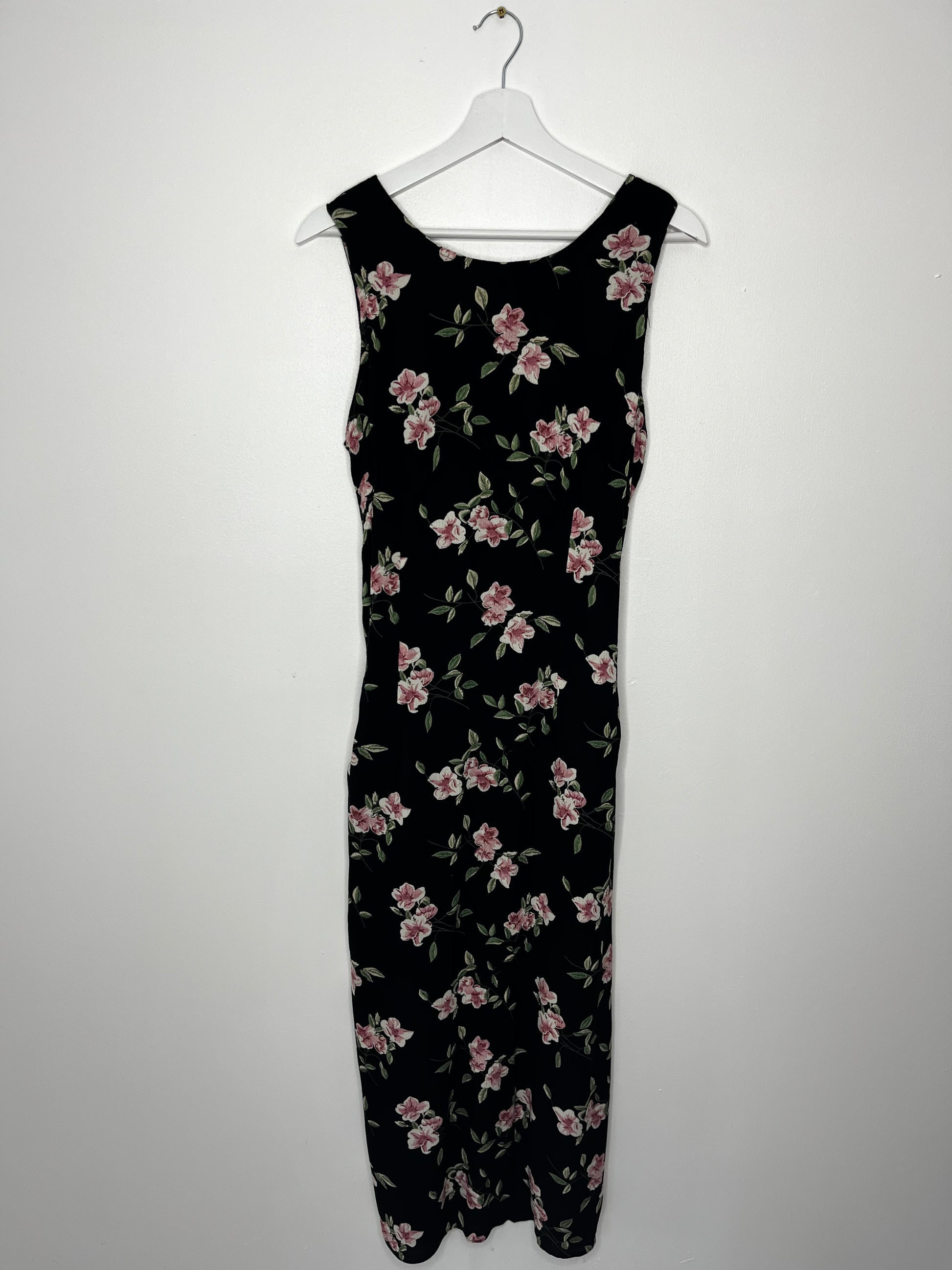 True Vintage Pink Flower Tie Back Black Long Dress